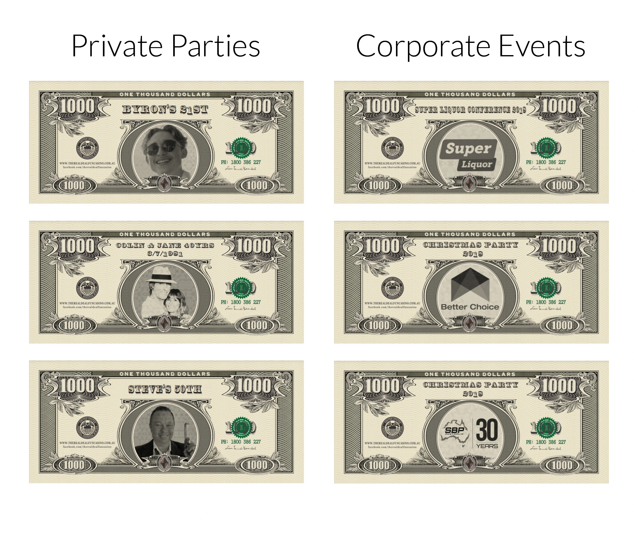- Private Parties: Celebrate birthdays, bucks nights, engagements or milestones with personalised fun money featuring a photo of the guest of honour and custom text like “Brian’s 21st” or “Jennifer’s 50th Celebration.”