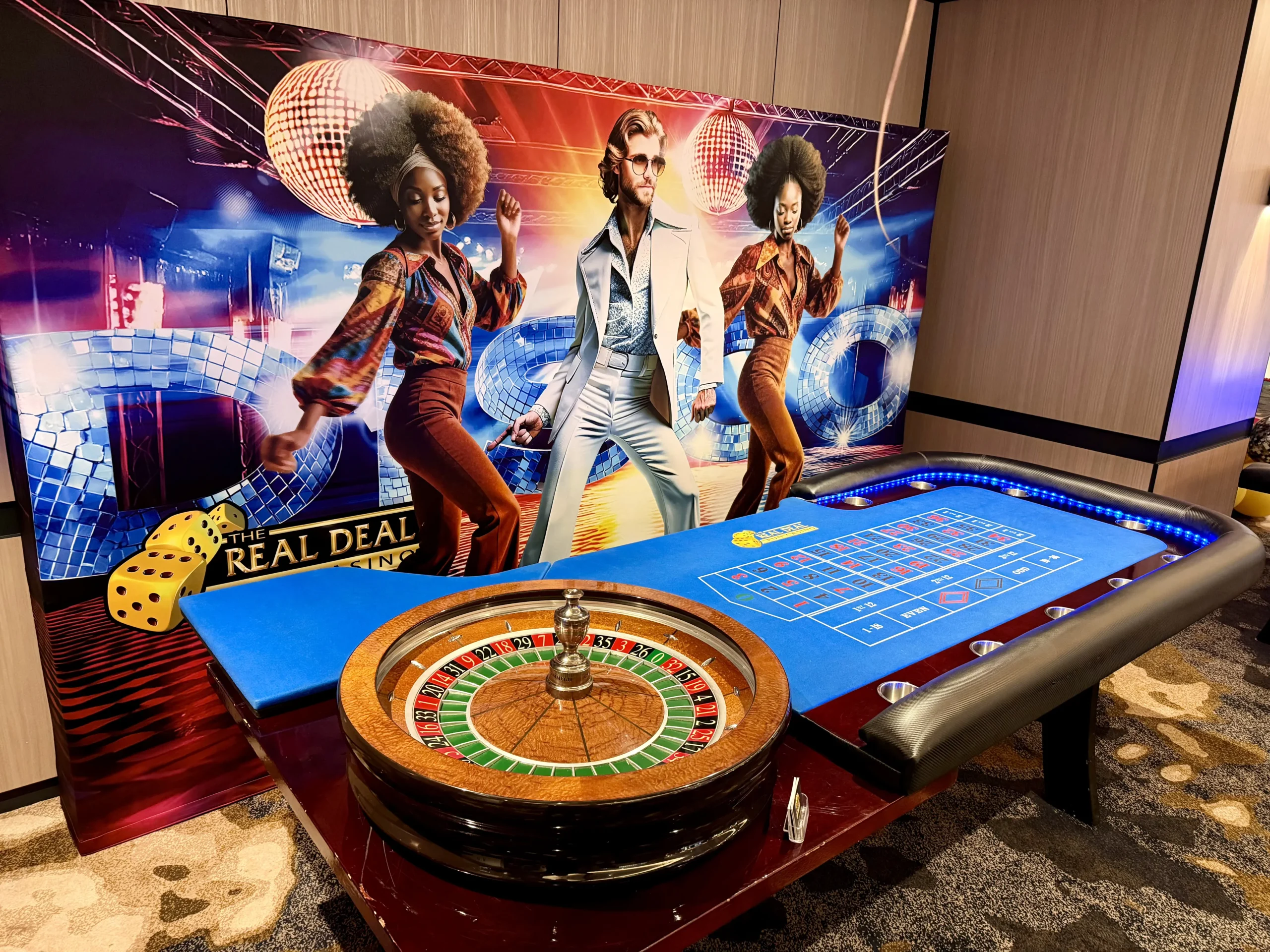 Whether you’re planning a themed birthday, corporate event, or retro celebration, our backdrop pairs perfectly with our casino party games. Add colour, energy, and nostalgia to your event space while giving guests the perfect photo opportunity. Bring the groove to your next event with The Real Deal Fun Casino’s 70’s Disco experience.